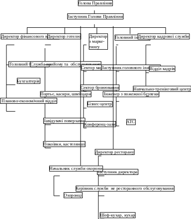 Організаційна структура готелю є відображенням повноважень та обов’язків, які покладені на кожного робітника. Ця структура досить складна, нестандартність її зумовлена функціональними особливостями та специфікою управління організацією.