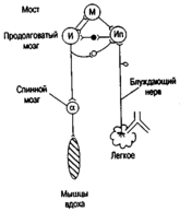 Представленная схема саморегуляции вдоха и выдоха на рис. 6.1 не отражает ряд известных в настоящее время процессов взаимодействия дыхательных нейронов моста, продолговатого мозга и афферентных импульсов от рефлексогенных зон, но она хорошо иллюстрирует принципиальную структуру механизмов саморегуляции вдоха и выдоха. Показаны три источника импульсов, обеспечивающих смену вдоха на выдох, торможение инспираторных нейронов (Ир и И): от нейронов моста (М), от самих инспираторных нейронов (Ир и И) и от рецепторов легких, импульсация которых поступает по блуждающим нервам [10;201].