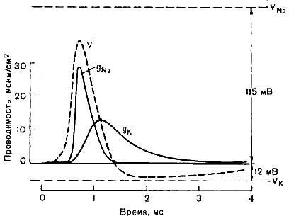 Рис. 2. Потенциал действия мембраны и динамика ионной проницаемости.