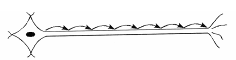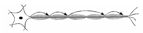 На всем протяжении нервного волокна через определенные промежутки (около 1 мм) миелиновая оболочка имеет перерывы. Данные немиелинизированные участки называют перехватами Ранвье. Отмечено, что в перехватах Ранвье возбудимость мембраны выше и больше плотность K-Na насосов, чем на миелинизированных участках мембраны аксона. При прохождении возбуждения деполяризуется мембрана в зоне перехвата Ранвье и возникает потенциал действия, который по своей электрической природе является переменным током. Благодаря электрическим особенностям миелина, локальные токи возбуждения не выходят в межперехватном участке, а деполяризуют следующий перехват Ранвье. Таким образом, электрический импульс движется как бы "скачками" (сальтаторно) между перехватами или даже через 2-3 соседних перехвата (Рис. 4), поэтому скорость проведения импульса по этим волокнам значительно выше (15-120 м/с).