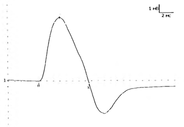 М-ответ (М-волна) (рис. 5) - суммарный потенциал мышечных волокон, регистрируемый с мышцы при стимуляции иннервирующего ее нерва одиночным стимулом. Обычно М-ответ регистрируют с помощью поверхностных электродов, которые более объективно и полно отражают суммарную активность мышцы по сравнению с игольчатыми электродами. При изучении М-ответа обращают внимание на следующие его характеристики.