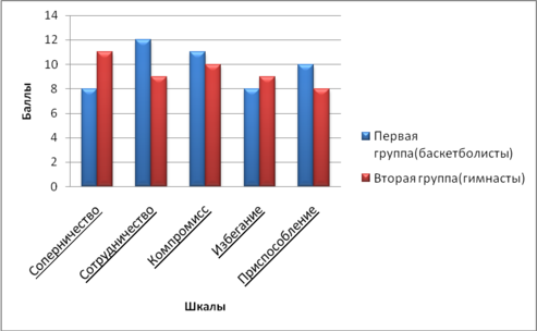 По результатам тестирования в обеих группах проявляется компромиссный тип взаимодействия и решения конфликтной ситуации, т.е. в обеих группах, независимо от того занимается спортсмен в команде или индивидуально, испытуемые готовы к частичным уступкам в межличностных отношениях и при решении конфликтных ситуаций.