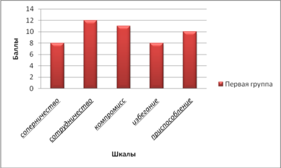 Средние показатели по методике «Оценка поведения в конфликтной ситуации» К. Томас в первой группе испытуемых
