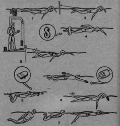 8. Стоя у поворотного щита боком к нему и наклонив туловище в его сторону, по сигналу выполнять поворот с отталкиванием (упражнение применяется при плавании кролем на спине).