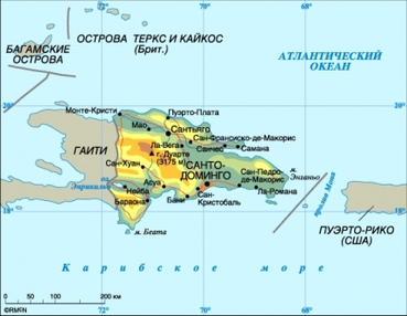 Домініканська Республіка разом з Гаїті розташовані на острові Іспаньола (о. Гаїті) між Карибським морем та Північним Атлантичним океаном, на сході від держави Гаїті. На півночі острів омивається Атлантичним океаном, на сході - протокою Мона, що відокремлює його від Пуерто-Ріко, на півдні - Карибським морем, а на заході Домініканська республіка має кордон з Гаїті. Домініканці здебільшого зберігають іспанські традиції і мають змішане африканське і європейське походження, в той час як гаїтяни зберігають французькі традиції і є переважно африканського походження. Домініканська Республіка займає площу в 48,4 тис. кв.км. Населення 8260 тис. чоловік (1999) [7].