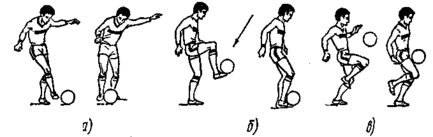 Рис. 7. Фінти: а – «відходом» з переносом ноги через м'яч; б – «ударом»; в – «зупинку»