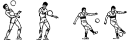 Удар бічною частиною чола використовується, коли м'яч летить збоку від гравця (Рис. 4). Вихідним положенням є стійка ноги нарізно (30–50 см). Якщо м'яч наближається ліворуч, то для замаху тулуб нахиляється вправо. Ударний рух починається з розгинання ноги і випрямлення тулуба. Вага тіла переноситься на ліву ногу.