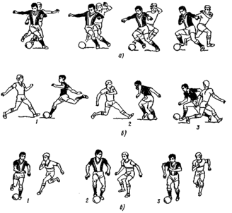 Відбирання м'яча в підкаті дає можливість опанувати м'ячем, що знаходиться на відстані більш 2 м від гравця. Відбирання виконується звичайно ззаду або збоку. Гравець, що атакує, зближаючись із супротивником, у падінні викидає ноги вперед. Сковзаючи по траві, він створює перешкоду на шлях м'ячу або вибиває його ногою (Рис. 8, б).