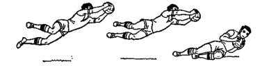 Для ловіння м'ячів, що летять на значній відстані, використовується падіння з фазою польоту (Рис. 11). У попередній фазі виконується один або два швидких приставних кроки в напрямку польоту м'яча. Поштовх виконується ближньої до м'яча ногою. Руки найкоротшим шляхом активно виносяться до м'яча. Ловіння м'яча виконується у фазі польоту. Після оволодіння м'ячем проводиться групування. Приземлення відбувається в такій послідовності: спочатку на передпліччя, потім на плече, тулуб, ноги.