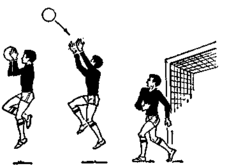 Щоб переривати «прострільні» і «начіпні» передачі, воротареві необхідно відбити м'яч на значну відстань. Для цього використовується удар по м'ячу одним або двома куркулями. Відбивання виконується на місці, у кроці, після різних переміщень і особливо часто в стрибку (Рис. 12).