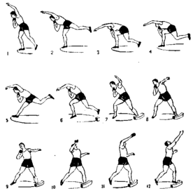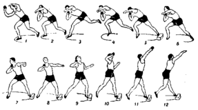 Рис. 2.6 - Техника толкания ядра из исходного положения «спиной» к направлению толкания