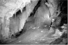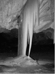 Зал Сказка обрывается 6 метровым почти вертикальным спуском в зал Призрачный. Этот зал явно образовался в результате обвала перекрытии между этажами. На потолке, в отличие от предыдущих залов, много острых выступов и глубоких впадин, а пол засыпан крупным и мелким обломочным материалом. Из зала Призрачного уходит влево галерея в виде арок, соединенных перекрытиями, названная на карте "Сашкиной Кондрашкой". Галерея имеет второй этаж с белой кальцитовой корой, больше похожей на "лунное молоко" и натечными образованиями в виде макаронин, конических сталактитов и геликгитов. В галерее довольно тепло. Встречаются отдельные ледяные образования - однолетние, прозрачные, красивые, причудливой формы. Только в одном месте есть толстый слой многолетнего льда. В галерее есть еще один выход на поверхность, крутой и обледенелый. Вправо от спуска в Призрачный, есть несколько шкуродеров, ведущих к Стражу. Они достаточно узкие и неприятные. В этой части Призрачного много земляных осыпей, одна перекрывает еще один выход на поверхность (из осыпи торчат бревна). Достопримечательностью этой части пещеры является ледяной потолок. Лед, его образующий, совершенно гладкий и покрывает примерно половину потолка. А дальше идет ровный перпендикулярный срез, обнажающий множество слоев этого льда, возраст которого, судя по количеству чередующихся темных и белых слоев, не менее 20 - 25 лет. В зал Главный можно попасть через Главный вход и через зал Ступеней. Главный вход - крутонаклонный грот, со снегом в верхней и льдом в нижней части. Начинается он в широкой овальной воронке, второе углубление которой занимает озеро. Воронка расположена в 300м от речного обрыва чуть ниже по склону от Центрального входа. Зал Главный - большой ледяной каток с низким потолком. Он имеет множество ответвлений, часть из которых закрыта обвалами или затянута льдом. Существуют проходы в зал Ступеней и Наклонный зал. В Наклонный зал из Главного сейчас пройти сложно, потому что горизонтальный канал, ведущий в него, больше чем наполовину закрыт льдом, и лед уже стекает по вертикальной щели, ведущий к нему. В Спальный зал проход закрыт толстым слоем прозрачного льда. Основной интерес в Главном зале представляет Сталактитовый грот. Грот представляет собой нишу, стены и потолок которой сплошь заросли сталактитами. Есть еще один проход между Главным залом и Призрачным. Он начинается слева от подъема в Наклонный, проходит мимо затянутого льдом Выхода № 3 и выходит в Призрачный зал недалеко от Стража.