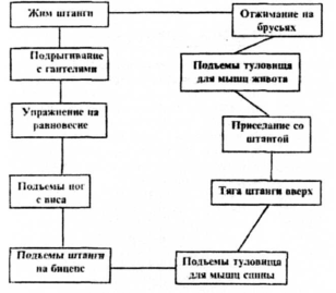 Из схемы видно, что последовательность станций такова, что в тренировочную работу вовлекаются удаленные друг от друга мышечные группы. Это позволяет избежать преждевременной усталости в любой мышце или группе мышц и тем самым добиваться максимальной нагрузки.