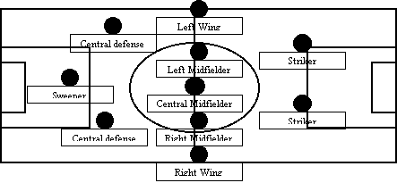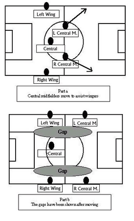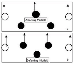 На рис. 2 (а), три центральных полузащитника расположены так, что двое из них подстраховывают атакующих полузащитников при игре в защите. Эта система используется Perspolisin Iran.