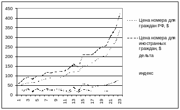 | Цена номера для граждан РФ, $ | Цена номера для иностранных граждан, $ | дельта | индекс |
