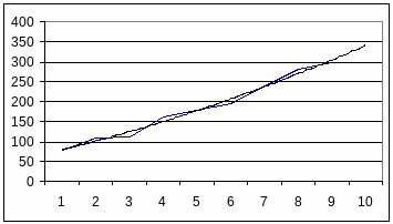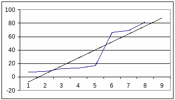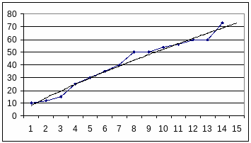 Полученный график позволяет говорить о сильной корреляции величины надбавки с величиной цены номера как факторного признака. С другой стороны, индекс этой величины ведет себя неравномерно по ряду. Остановимся на этом подробнее. Первоначально разобьем весь интервал на два очевидных ценовых диапазона и построим кривые тренда:
