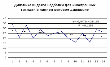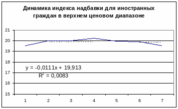 В верхнем ценовом диапазоне наступает стабилизация. Полученный коэффициент линейного ускорения ничтожно мал и позволяет говорить о стабильности величины надбавки для не резидентов, которая колеблется вокруг величины в 20% от цены для резидентов. Таким образом, можно говорить о том, что с повышением уровня гостиницы относительная величина надбавки для не резидентов снижается и достигает стабильных величин для уровня цен свыше 169$ за номер. Это, в свою очередь, подтверждает полученные выше данные об опережении роста качества услуг на российском гостиничном рынке по сравнению с ростом цен на них.