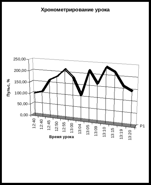 По данному измерению мы видим, что урок прошел умеренно, с большим временем отдыха, что приемлемо для организма человека. Нагрузка на организм небольшая. Общим для этих нагрузок является их основная задача - подготовка организма к последующей деятельности. Однако содержание этих нагрузок существенно различно в зависимости от частных задач.