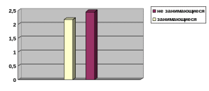 Среднее значение адаптационного потенциала у девушек, занимающихся спортом, составило =(2,07+2,08+2,37)/3=2,17 балла