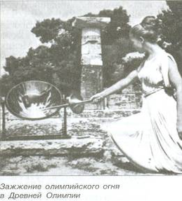 Мысль о том, чтобы зажигать олимпийский огонь прямо на древней прародине этого прекрасного праздника, родилась у Кубертена еще в 1912 году. Продумал оп и весь торжественный, романтический ритуал зажигания огня. На факел направляют пучок солнечных лучей, собранных вогнутым зеркалом. Вот факел задымился. Еще секунда о он вспыхивает ярким неугасимым огнем! Это здорово, это по-настоящему красиво... А солнце над Олимпией все то же -- древнее, мудрое, жаркое. И развалины древних храмов — именно возле них происходит церемония помнят героев минувших Олимпийских игр... Традиция зажигать олимпийский огонь на стадионе взяла свое начало в 1928 году, па I4грах в Амстердаме. А на зимних Играх это произошло в 1952 году в Осло. Эстафета же олимпийских факелов, первый из которых вспыхивает в Олимпии, впервые состоялась в 1936 году. Зажженный огонь день и ночь несут факелоносцы в дождь, в снегопад, в штормовой ветер; поэтому они должны быть очень мужественными людьми. Но и еще одно: вместе с главным факелом зажигают несколько... как тут сказать, запасных? Их огонь хранится в специальных лампах на всякий случай. Последние шаги, последний круг по дорожке олимпийского стадиона... Эта честь обычно предоставляется лучшему, одному из наиболее известных спортсменов страны, где проводятся Олимпийские игры, У нас, например, на играх в Москве зажег Сергей Белов, знаменитый баскетболист, чемпион мира, олимпийский чемпион.
