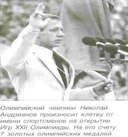 Олимпийские клятвы — их две. Первая от имени участников. Текст ее предложил Пьер де Кубертен. Правда, теперь клятва несколько видоизменилась. Вот как она звучит в наши дни: «От имени всех спортсменов я обещаю, что мы будем участвовать в этих Играх, уважая и соблюдая правила, по которым они проводятся, в истинно спортивном духе, во славу спорта и во имя чести своих команд» Торжественные и очень убедительные слова. Так имеют право говорить только настоящие атлеты, благородные люди. На Играх в Москве их произнес гимнаст Николай Андрианов. А впервые олимпийская клятва прозвучала в 1920 году. Вторая — клятва спортивных арбитров. Этой олимпийской традицией нашей стране, быть может, стоило бы гордиться особо, Она появилась на Играх-б8 в Мехико. И предложил ее наш Олимпийский комитет! Текст клятвы таков: «От имени всех судей и официальных лиц я обещаю, что мы будем выполнять наши обязанности во время этих Олимпийских игр со всей беспристрастностью уважая и соблюдая правила, по которым они проводятся в подлинно спортивном духе» И в этой клятве доходчивые, а главное — ответственные слова!