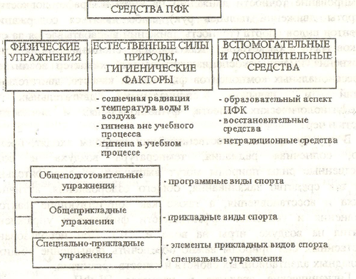 Средства ППФП можно условно представить следующими группами: общеподготовительные (общеразвивающие), общеприкладные, специально-прикладные упражнения; естественные силы природы и гигиенические факторы; вспомогательные и дополнительные средства.