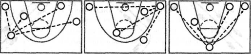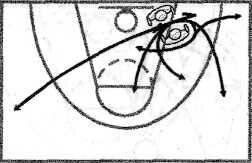 8. Зв'язки хитрощів, напрям отримання м'яча (від кільця, до кільця, «чорний хід», в трьох секундну зону, на протилежний фланг) необхідно постійно міняти (мал. 6). Одноманітні дії нападаючою без м'яча полегшують дії захисту.