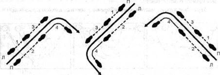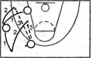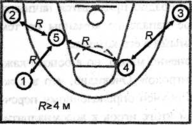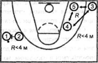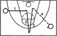 4. Якщо нападаючий знаходиться ближчим до м'яча або має перевагу в швидкості, то він може рухатися в місце отримання м'яча по прямій. Але якщо захисник знаходиться в безпосередній близькості і грає в закритій стійці, то нападаючий, що відкривається, застосовує правило "один крок, три кроки, п'ять кроків". Сенс цього правила в наступному. На лівому фланзі нападу гравець робить один, три або п'ять кроків до кільця, починаючи рух лівою ногою, в напрямі, не відповідному бажаному напряму руху до м'яча. Після першого, третього або п'ятого кроку гравець штовхається лівою ногою, різко міняє швидкість і починає рух в точку отримання м'яча. Він виконує V або L-образний рух, але важливо, що в даному випадку гравець починає рух саме з правої ноги, сильно штовхаючись лівою. В цьому випадку йому зручно стартувати в новому напрямі після першого, третього, п'ятого кроку (мал. 4).