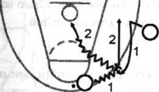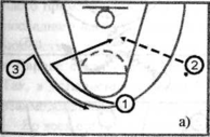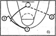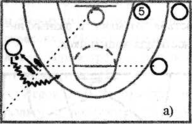 Гравець № 1 починає рух на постановку заслону, але, не доходячи до місця постановки заслону, здійснює ривок до кільця. Його захисник готується до боротьби із заслоном і часто не готовий до подібного маневру (мал. 20-а).