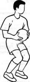А). Гравець веде м'яч правою рукою і при наближенні до партнера виконує зупинку стрибком на дві ноги або двохкрокову (права - ліва), повертається спиною до корзини, що атакується.