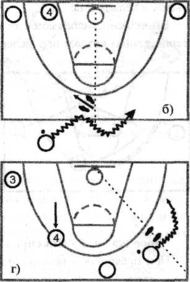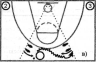 Дуже поширений напад, коли два великі гравці піднімаються в район лінії фолів (мал. 21-в). В цьому випадку двійка можлива і управо, і вліво. Складне підстраховування, особливо якщо великий гравець, який піднімається після взаємодії другого великого з дриблером, володіє трьохчковим кидком.