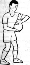 Гравець веде м'яч правою рукою і при наближенні до партнера виконує зупинку стрибком на дві ноги або двох крокову (права-ліва), повертається спиною до корзини, що атакується, на правій нозі. При проході партнера впритул гравець, що виконує передачу, розташовує праву кисть під м'ячем і притискує правий лікоть до правого боку. Ліва кисть знаходиться зверху м'яча, а лікоть зігнутої руки піднімається напроти грудей (мал. 17).