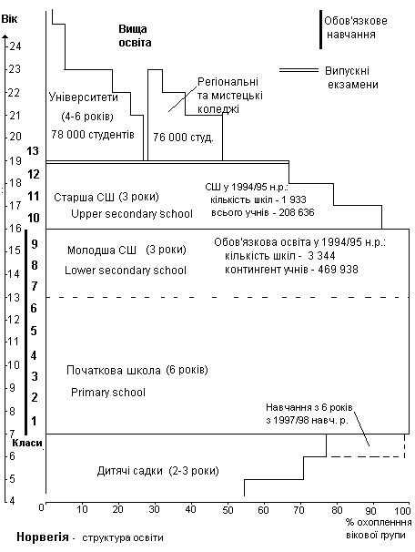 Більшість шкіл Норвегії державні. Приватних шкіл в країні близько трьох відсотків. Початковому навчанню відводиться 13 літній термін. З них початкова школа - 3 роки, середня школа - 7 років, старша школа - 3 роки.