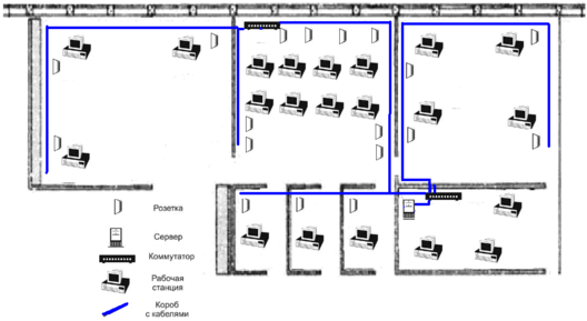 Основная проблема при разработке проекта сети – выбрать наилучший путь прокладки кабелей от рабочих мест, и размещения коммутатора. Тут очень много зависит от планировки, материала и толщины стен, и общие рекомендации дать сложно. Тем не менее, задача эта не сложная, и для ее решения вполне достаточно здравого смысла. В любом случае, эскиз весьма условен, и небольшие коррекции по мере строительства сети пойдут ему только на пользу.