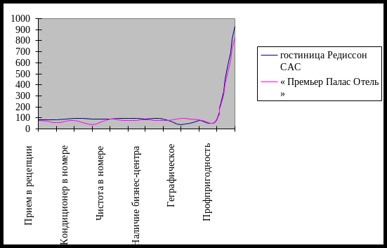 Гостиница Редиссон САС является одним из самых серьезных конкурентов гостиницы « Премьер Палас Отель » по ценовому сегменту рынка. Всего было опрошено 56 человек. Так как количество опрошенных примерно в два раза меньше опрошенных при выяснении индекса потребительской удовлетворенности по гостинице « Премьер Палас Отель », то результаты следует увеличить в в 1,9 раз (108/56 = 1,9). Для удобства сравнения степени потребительской удовлетворенности гостиничных услуг, предоставляемых вышеупомянутыми гостиницами построим карту профилей потребительской удовлетворенности.