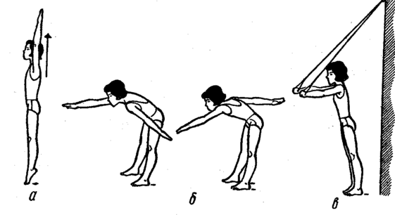 4. І. п. — стоячи, руки вгорі, кисті сполучені (голова між руками). Піднятися на шкарпетки, потягнутися вгору; напружити всі м'язи рук, ніг і тіла; потім розслабитися. Повторити напругу 5—6 разів. Ця вправа підводить до правильного виконання ковзання і умінню тримати тулуб при плаванні напруженим (мал. 23, а).