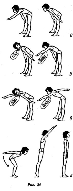 7..Руху руками. кролем у поєднанні з, диханням. І. п. — стоячи, ноги на ширині плечей. Нахилитися вперед, одна рука витягнута вперед, інша — назад. Обернути голову у бік витягнутої назад руки і поглянути на неї. Зробити вдих і почати гребкові рухи руками з одночасним видихом (мал. 24, в).