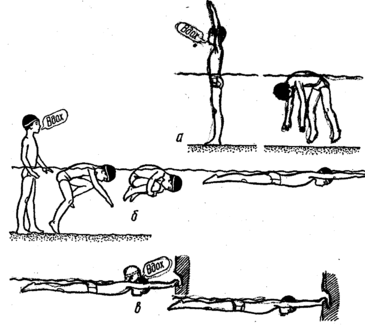 Вправи цієї групи виховують в тих, що займаються відчуття опори об воду долонею, передпліччям, стопою і гомілкою (що необхідне для постановки гребкових рухів), привчають не боятися води.