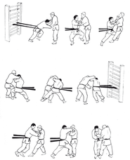 В работе Г. Пархомовича (1993) описывается способ использования японскими дзюдоистами резины в противоположном направлении, за счет ее крепления к самому атакующему. Резина вначале не оказывает противодействия и только при выходе в околостартовую позицию начинает оказывать значительное сопротивление, чем затрудняет атакующему действия по собственному перемещению относительно противника на старте броска (рис. 7, рис. 8).