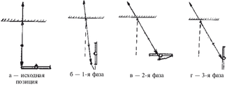 При использовании резиновых жгутов (пружин), противовесов, соединенных через тросы на блоках, закрепленных к жесткой опоре, силовое воздействие на пружину (резину, трос с противовесом) при проворачивании всегда направлено вдоль троса (рис. 5). При этом противоусилия с троса, как правило, не копируют противоусилий, которые возникают при воздействии на тело противника в каждой фазе броска проворотом. Особенно это несоответствие проявляется при приложении усилий через горизонтально натянутый трос (рис. 6).
