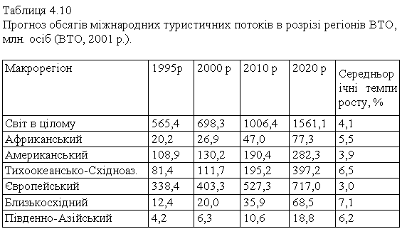 Незважаючи на долання кризових явищ, Всесвітня туристична організація прогнозує подальше зростання туристичного процесу до 2020 р. з щорічними темпами у 4,1%. Враховуючи виявлені тенденції, прогнозується перерозподіл туристичних потоків (таблиця 2.3).