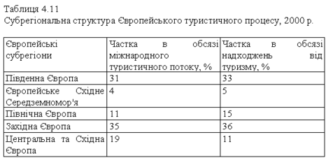 Європа та Америка й надалі збережуть свої лідерські позиції, але темпи зростання обсягів міжнародного туризму тут зменшаться і це позначиться на перерозподілі світового туристичного процесу: частка Європи зменшиться до 46%, Америки – до 18%. Після 2010 р. Америка поступиться другим місцем Тихоокеансько-Східноазійському макрорегіону, частка якого у світових туристичних переміщеннях зросте до 25%. Експерти ВТО прогнозують для цього і решти південних макрорегіонів підвищені темпи зростання обсягів туристичної діяльності перш за все за рахунок розбудови індустрії туризму. В той же час прогнозується зменшення темпів зростання подорожей на далекі відстані (3,8%) порівняно з внутрішніми континентальними (5,4%). Відповідно, їх свіввідношення в подальшому зміниться на користь останніх і становитиме 76:24 (2020 р.) проти 82:18 (1995 p.). Європейський і Американський макрорегіони концентрують основні внутрирегіональні потоки, зростає обсяг внутрішніх переміщень між країнами Тихоокеансько-Східноазійського макрорегіону. Туризм, що зародився й зростав у Європі, поступово поширюючись світом, і надалі залишиться серед населення країн регіону найпопулярнішою формою дозвілля. Європа, незважаючи на певне падіння темпів росту міжнародного туризму (6,1% у 2000 р. проти 7,4% середньосвітового приросту) і зменшення частки (за рахунок перерозподілу) у світовому туристичному потоці залишається світовим лідером туристичного руху, прийнявши у 2000 р. 403,3 млн. туристів. При цьому 86% з них – це туристи з європейських країн, 6,6% становлять туристи з Америки та 3,6% – з країн Азії. Як видно з таблиці 4.11, туристичний процес концентрується в країнах Західної та Південної Європи, які здатні задовольнити найрізноманітніший попит практично у всіх сегментах туристичного ринку.