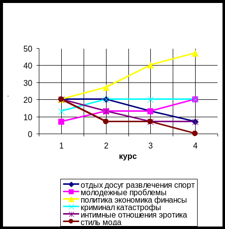 На данном графике хорошо прослеживается тенденция возрастания интереса к политической тематике. Также наблюдается рост интереса к молодежным проблемам. Почти постоянен интерес к криминальной хронике. По остальным показателям мы наблюдаем спад.