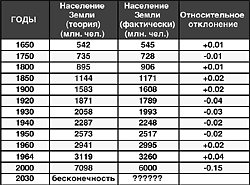 Головний висновок: до 2030 р. ріст народонаселення Землі теоретично повинний статі нескінченним. Як видно з таблиці, приблизно до 1970-х (може бути, до 1980-х) років цей ріст дуже точно відповідав теорії гіперболи - відносне відхилення складало не більш 4%! Звичайно, у реальності в міру наближення до катастрофічної осі 2030 р. ріст населення небагато сповільнюється - і в 2000 р. відносне відхилення від теорії досягло вже 15%. Однак і теорія, і практика демографії підказують, що державне регулювання народжуваності не зможе стримати невтримний ріст, що очікує нас.