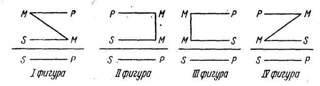 Мы поставили своей задачей решение вопроса, сочетание каких суждений может давать правильные силлогизмы. Казалось бы, что указанным способом мы разрешаем тот вопрос, который нас интересует, но в действительности это не так, потому что при составлении этих сочетаний нужно принять в соображение ещё положение среднего термина в посылках. В том силлогизме, который мы до сих пор рассматривали, средний термин в большей посылке является подлежащим, а в меньшей посылке — сказуемым. Но среднему термину мы можем придавать произвольное положение: мы можем средний термин сделать сказуемым в обеих посылках, или подлежащим в обеих посылках, или, наконец, сказуемым в большей посылке и подлежащим в меньшей. Сообразно с этим мы получаем так называемые четыре фигуры силлогизма, которые и изображены на прилагаемой схеме.