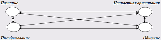 Общение предстаёт как вид деятельности, опосредующий три других, но ими же порождаемый и стимулируемый. Это значит, что четыре основных вида человеческой деятельности образуют замкнутую систему, в которой каждый вид связан с остальными прямыми и обратными связями, т.е. испытывает в них необходимость и ими же поддерживается и опосредуется.