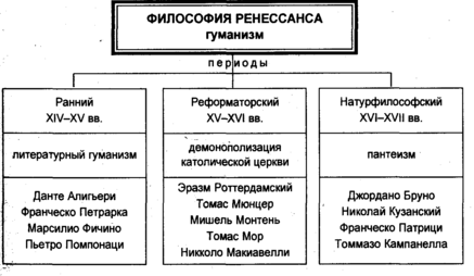 Поворот к антропоцентризму нельзя понимать упрощенно как утверждение человека главным объектом любого познания или как некое выражение материалистических воззрений. Суть в том, что гуманизм Ренессанса проявлялся в революционных идеях, обращенных на внутреннюю, земную «божественность» человека, в отказе от внешней «институциональной» божьей истины, в привлечении человека к жизненной активности, в утверждении веры человека в себя. Но и это новое, несомненно прогрессивное, будучи исторически обусловленным, могло про явиться лишь в той или иной форме, определяемой рамками религии. Реализация гуманизма предполагает освоение достижений культурного богатства прошлого, поэтому вновь пробуждается интерес к многоликому богатству древней философии. Вновь и по-новому открывается Платон, Аристотель, ряд других философов и школ античности (см. схему).