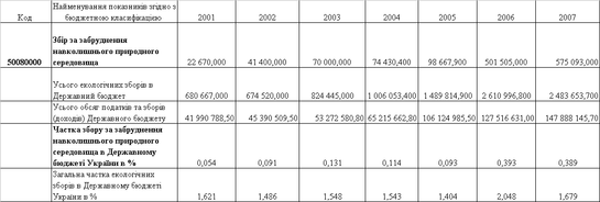 В Додатку А наведені статистичні дані Державних бюджетів України за 2001 – 2007 роки [814] по рівню екологічних зборів за використання природних ресурсів.