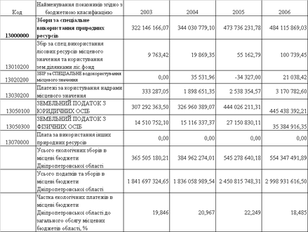 3.1 Динаміка показників обсягів екологічних зборів за використання природних ресурсів в Державний бюджет України за 2001 – 2007 роки та місцеві бюджети у Дніпропетровській області за 2003 – 2006 роки