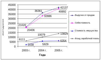 Из данных рисунка 1 видно, что за анализируемый период значительно увеличилась выручка от продаж. Фонд заработной платы выше, чем стоимость имущества, что связано со спецификой финансово-хозяйственной деятельности предприятия.